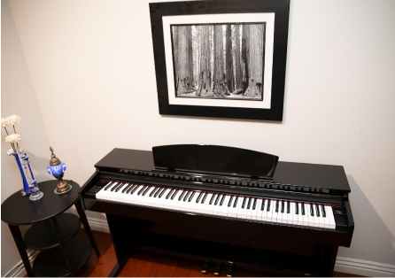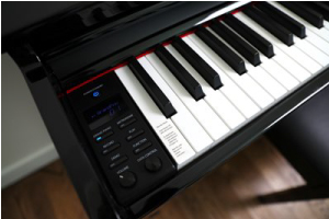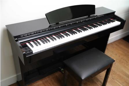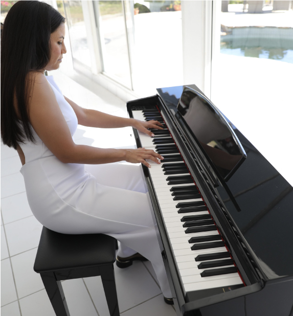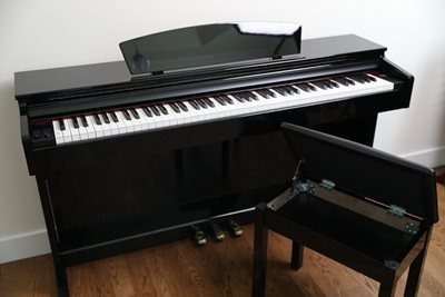 The A100's ebony polished cabinets add elegance to any room with their stunning high gloss finish. This piano has weighted keys with the same feel and responsiveness as an acoustic grand piano, and features lush piano tones. With twist of a knob you can enjoy electric pianos, organs, strings, and more!
