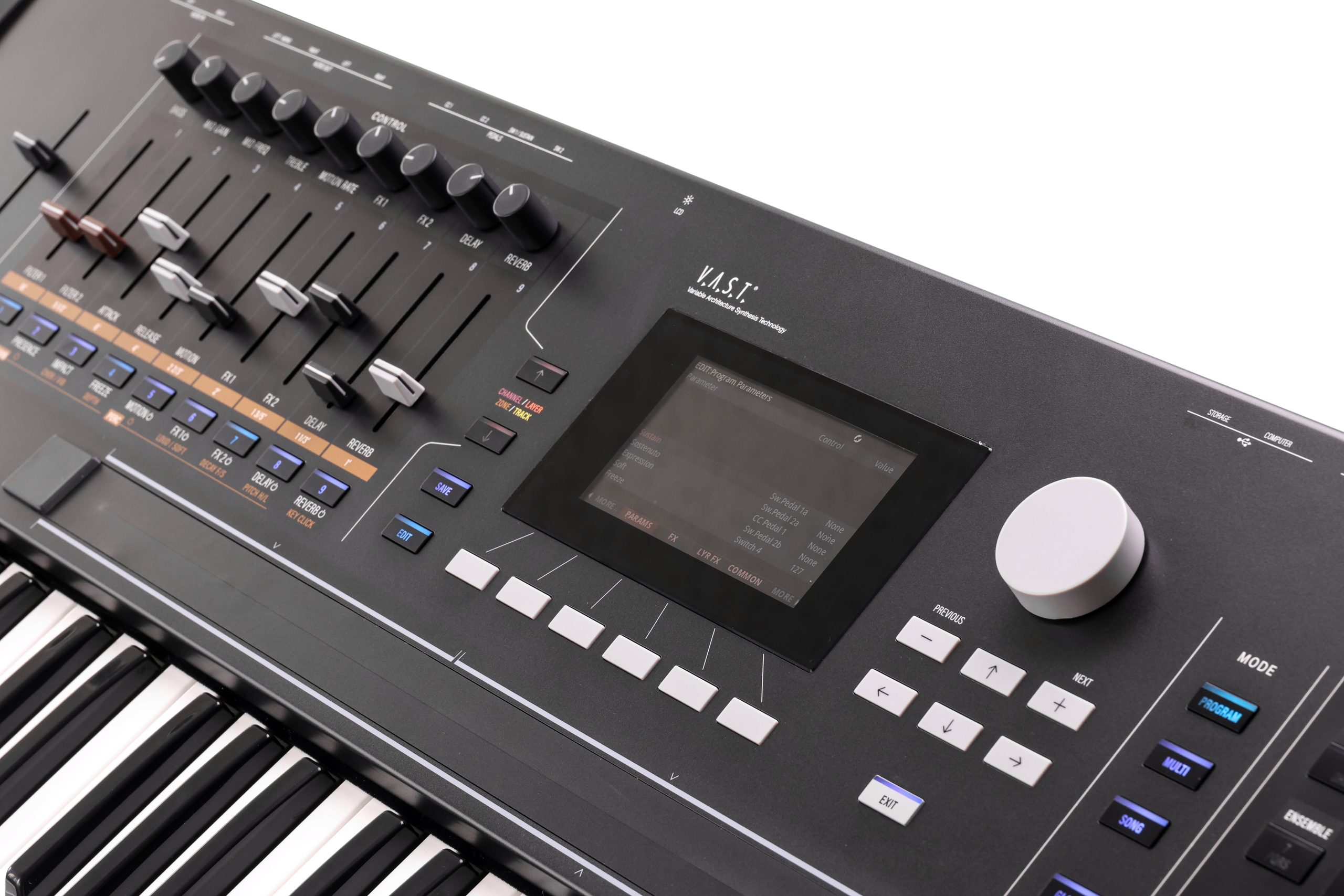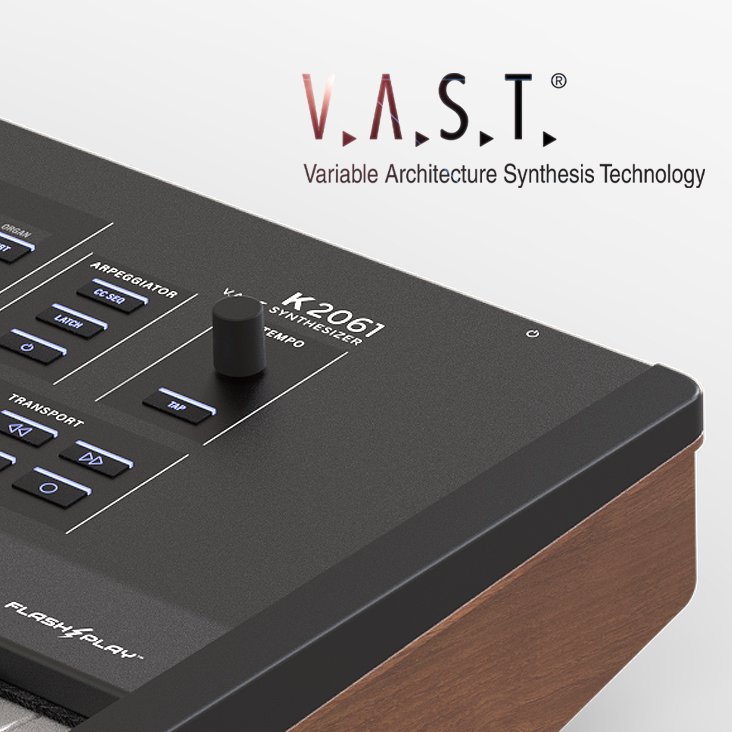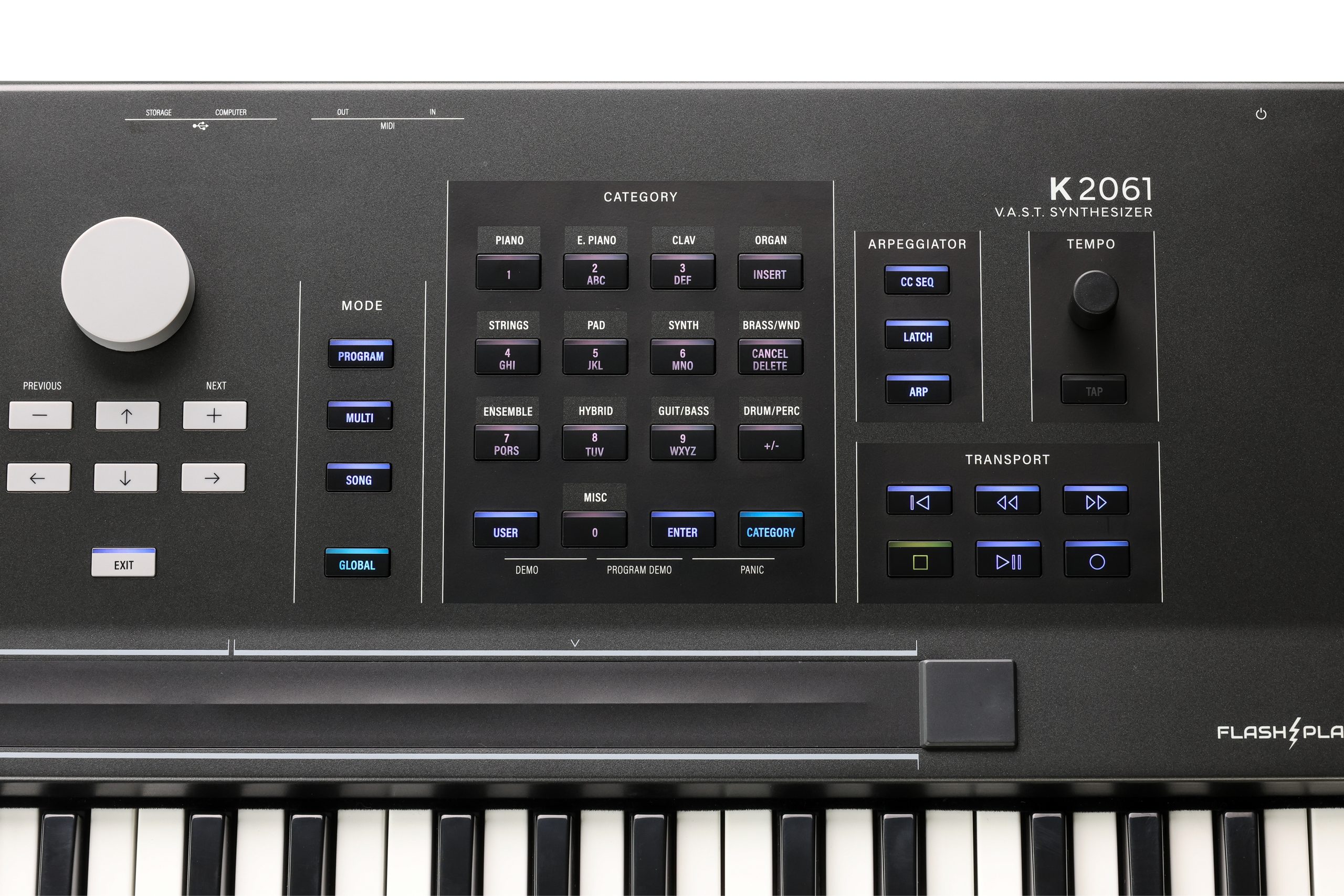 The K2061 V.A.S.T. synthesizer combines modern industrial design with a deep factory sound library of over 2000 Programs and over 500 Multi combinations organized into 113 instrument categories featuring many legacy K2 era synth-forward selections.