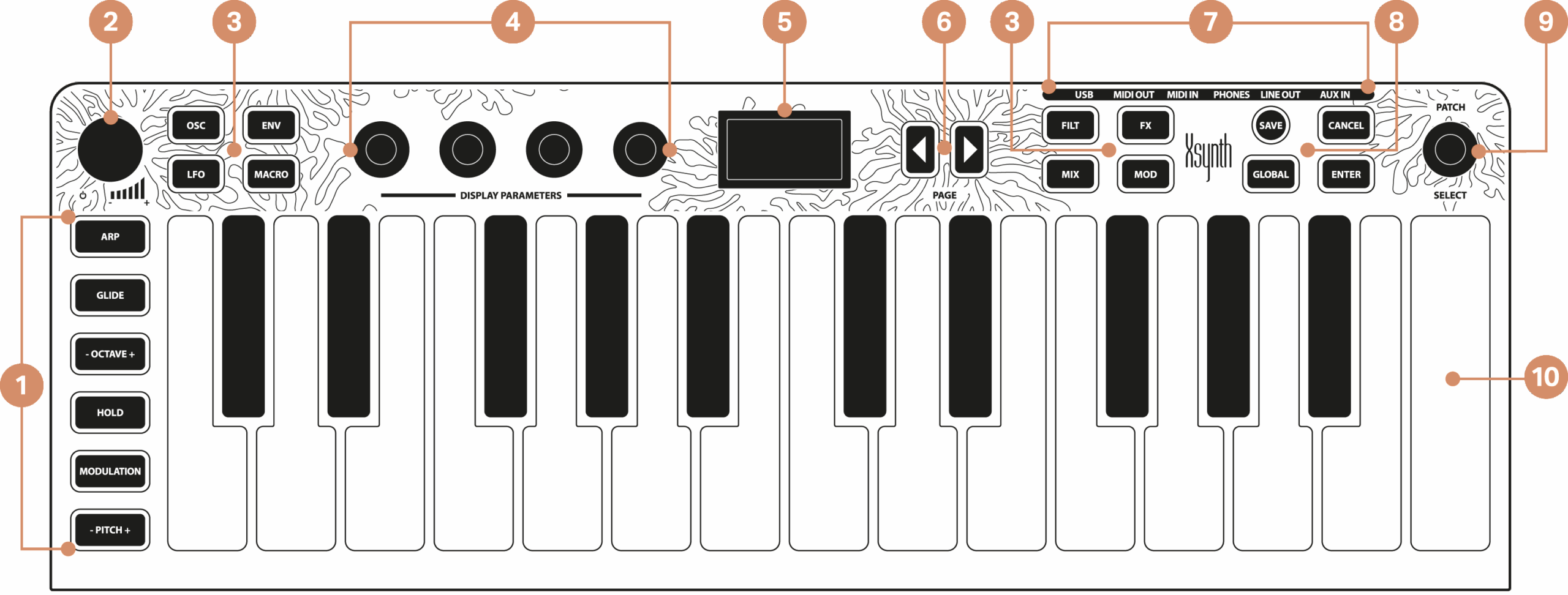 Xsynth may be ultra-thin and highly portable, but it’s fully equipped for serious performance. It features USB, MIDI In and Out, Headphone output, Line Out, and Aux In—giving you all the essential connections for studio, stage, or spontaneous creativity.